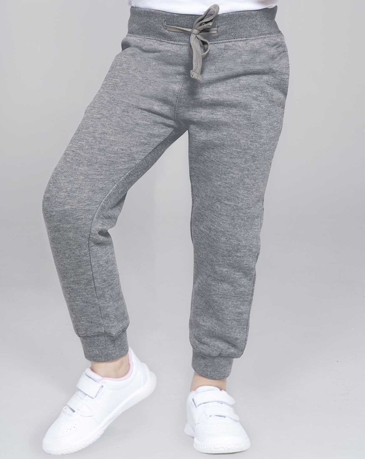 Calças esportivas longas para crianças, com bolsos laterais, punhos na barra e cintura elástica com cordão ajustável.