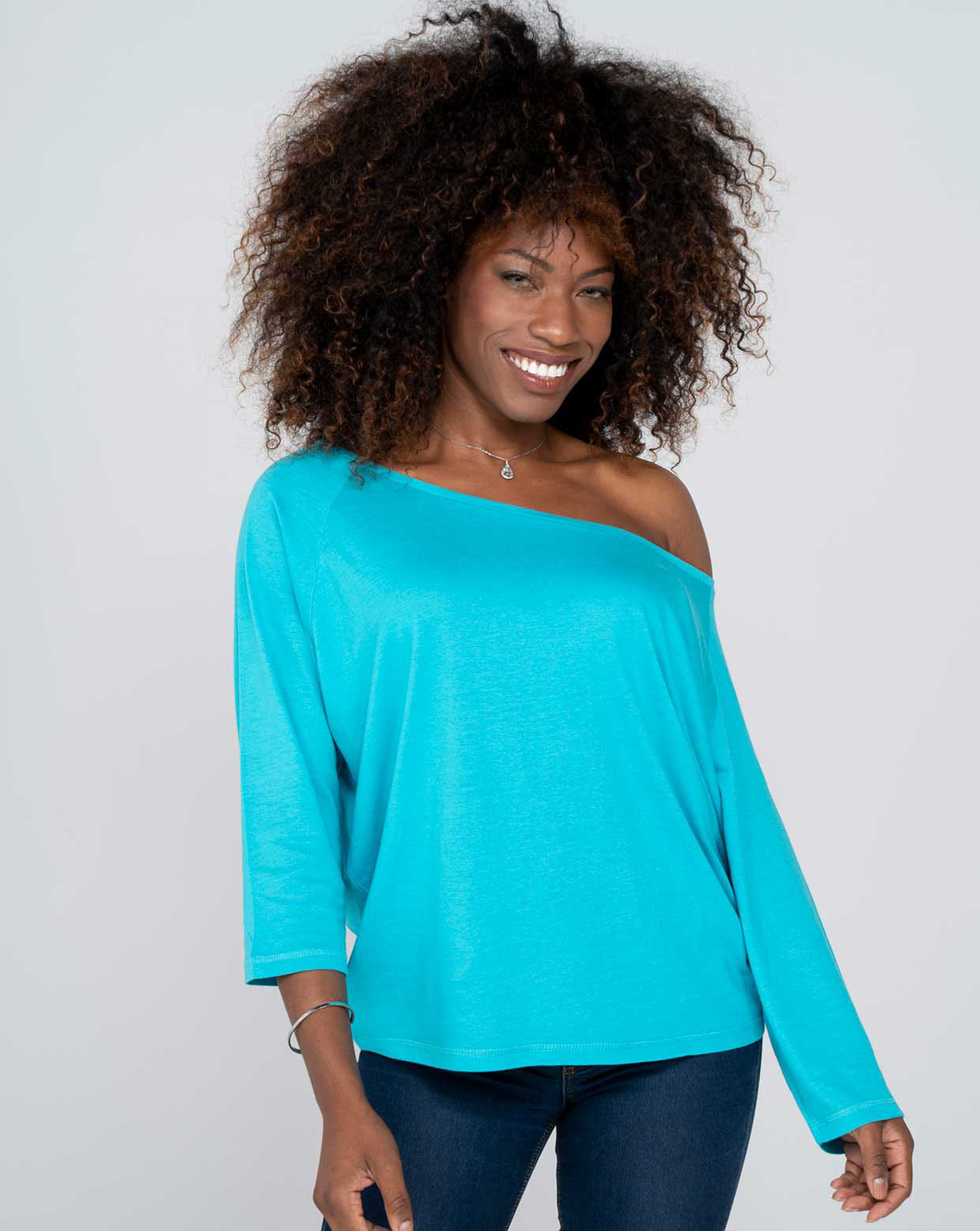T-shirt de senhora com mangas 3/4 raglan e gola redonda larga. Etiqueta removível. Disponível em 11 cores.