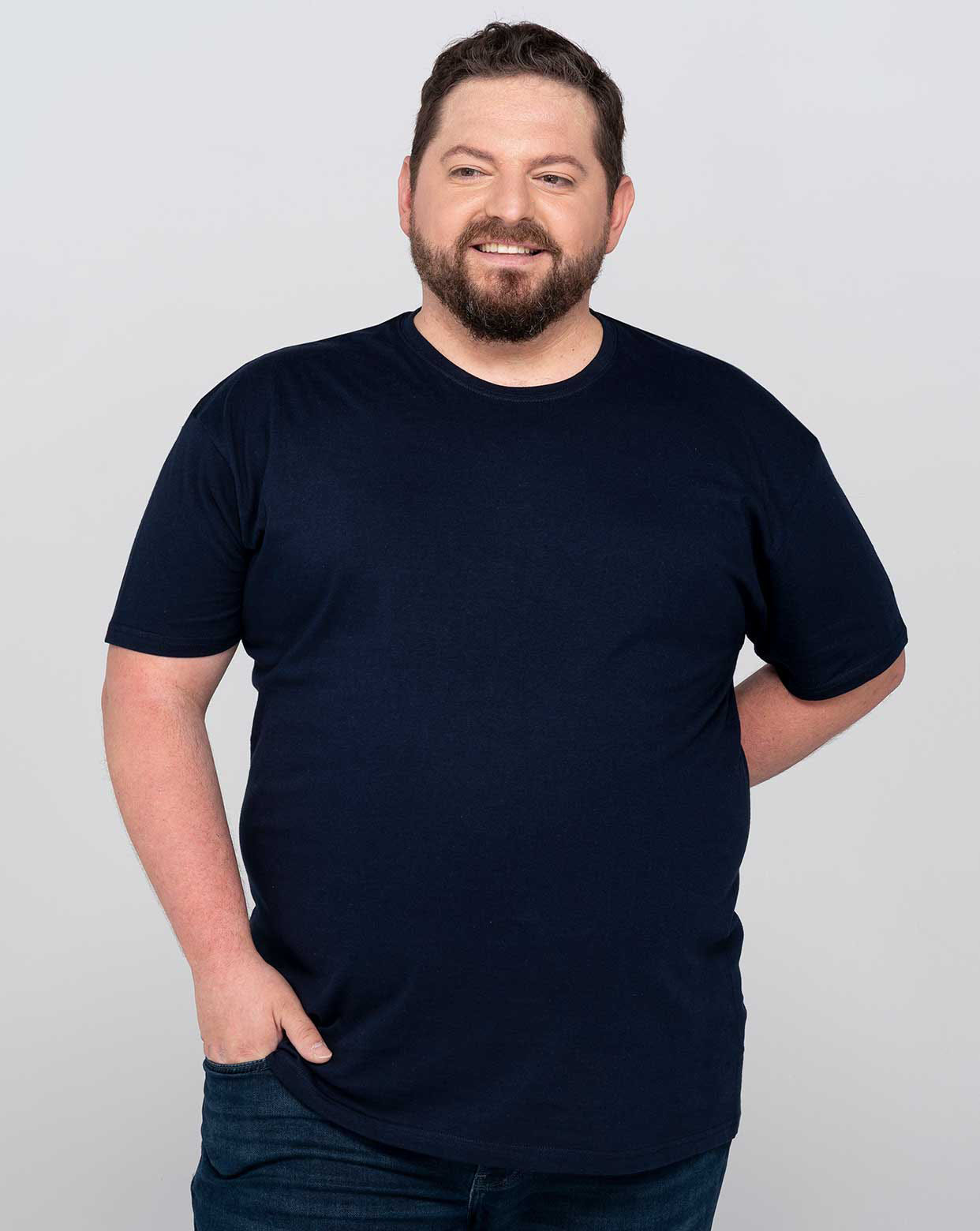 T-shirt básica para homem com mangas curtas, 100% algodão. Ideal para personalizar com silkscreen, vinil, transferência e impressão digital. Também disponível para mulheres, crianças e tamanhos grandes (linha Curves), do tamanho XS ao 5XL. Tecido tubular. Dupla costura no pescoço, mangas e em baixo. Reforço de ombro a ombro. Gola em elastano. CM and Fluor side-seamed. 3XL: BK, NY, RB, WH, RD, OR, SY. GM - 85% Algodão / 15% Viscose AS - 98% Algodão / 2% Viscose Fluor - 100% Poliéster. Heather: 65% Poliéster / 35% Algodão DNH - 60% Algodão / 40% Poliéster REF: TSRA150WLT - T-shirt 4 cm mais larga, especial para tingir.