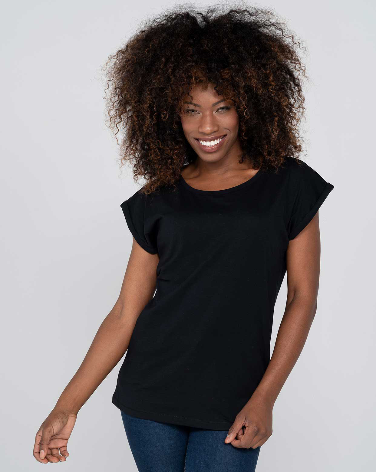T-shirt de manga curta feminina em jersey simples, gola redonda larga e com mangas enroladas, 100% algodão. Etiqueta removível. Disponível em 4 cores.